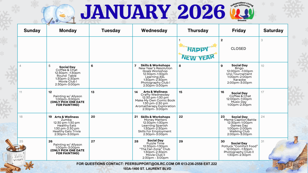 - January 7th – New Year’s Resolution Goals Workshop 12:30 pm-1:30 pm, Learning ASL 1:30 pm-2:30 pm, Photography Club l 2:30 pm-3:00 pm